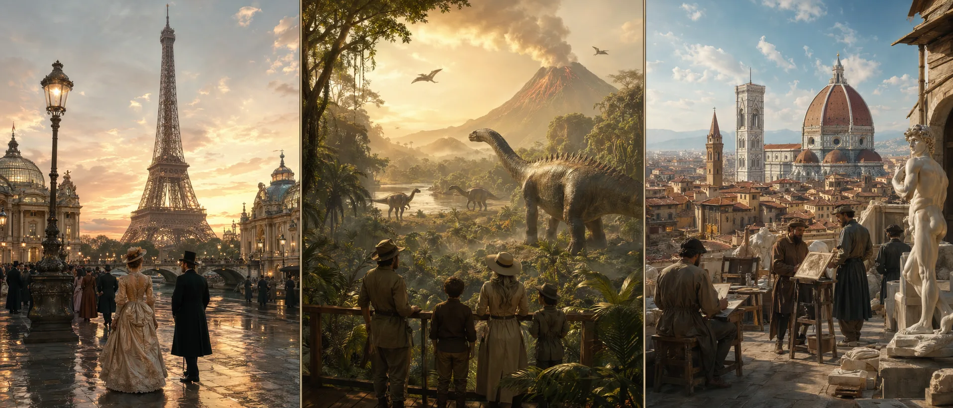 Trois signatures de voyage: raffinement Belle Epoque, expedition prehistorique et atelier Renaissance.